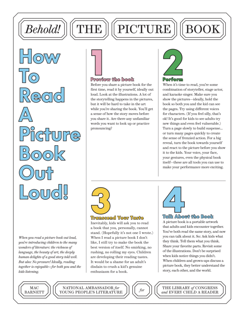 As Ambassador, Mac Barnett’s emphasis is on picture books, a vibrant but often overlooked art form. As part of this platform, Mac is asking grown-ups to “Consider the Picture Book” through a series of events, written pieces, and informative resources for adults.