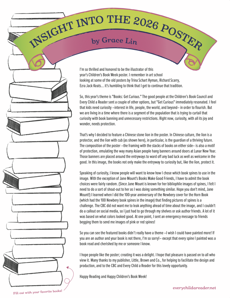 Grace Lin said, “I’m so thrilled and honored to be the illustrator of this year’s Children’s Book Week poster. I remember in art school looking at some of the old posters by Trina Schart Hyman, Richard Scarry, Ezra Jack Keats . . . it’s humbling to think that I get to continue that tradition.”