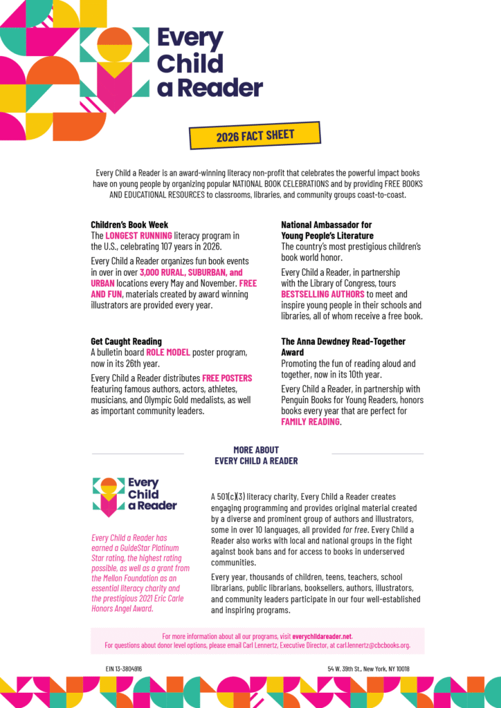 Every Child a Reader is an award-winning 501 (c)(3) charity dedicated to inspiring a love of reading in children and teens across the United States. By making a tax-deductible donation to Every Child a Reader, you can take a much-needed step to encourage young people to read and to succeed in school and in life, and to support the vital work that teachers and librarians do every day.